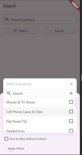 Use this code to display a bottom sheet to display the filters view where the user can apply some filters on product searches. I have also used CustomDropdown package to quickly implement multi-select dropdown functionality. Read more about this package here https://pub.dev/packages/animated_custom_dropdown